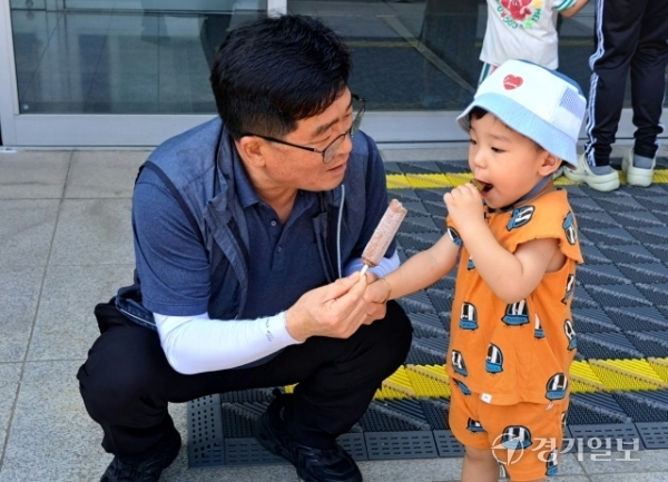 인천광역시의 김희석씨가 손자 김지후군에게 아이스크림을 건네며 환하게 웃고있다. 박귀빈 기자